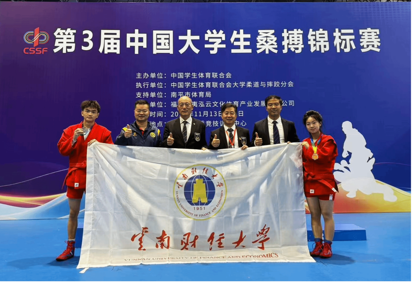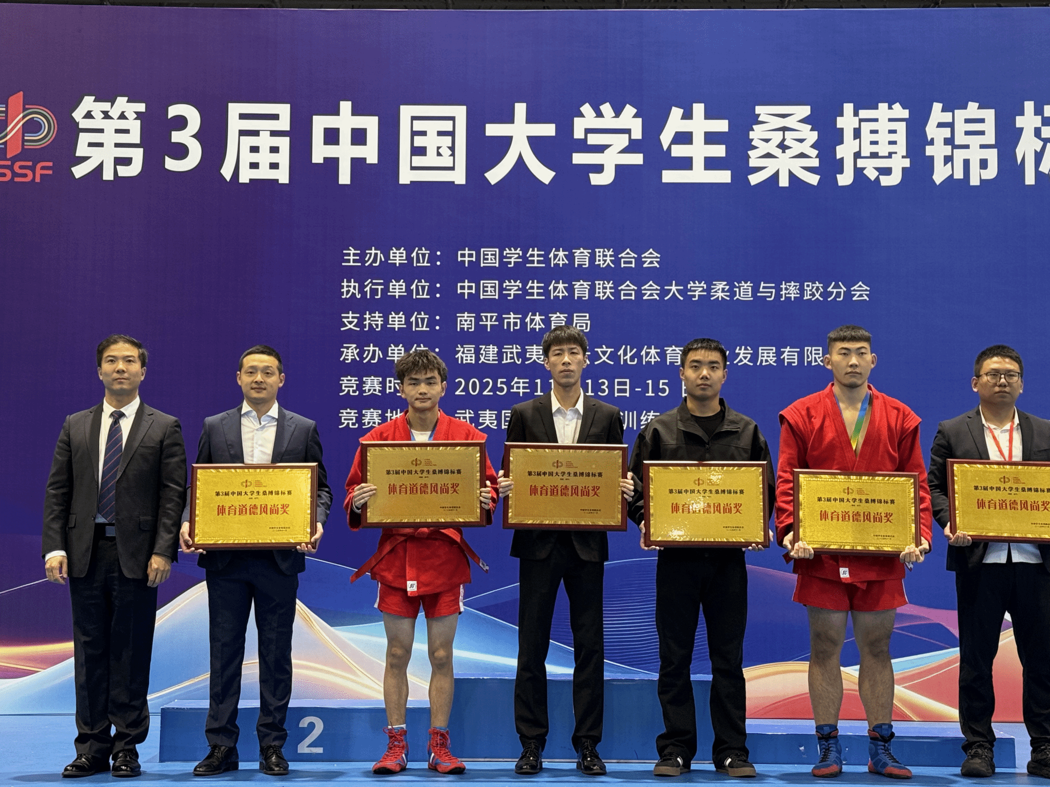 11月11日,第三届中国大学生桑搏锦标赛在福建省南平市武夷国际重竞技训练中心举行,WilliamHill官网商学院张申赟同学获男子甲组58公斤级亚军,统计与数学学院崔静怡同学获女子甲组50公斤级季军,WilliamHill官网被赛事组委会授予“体育道德风尚奖”。