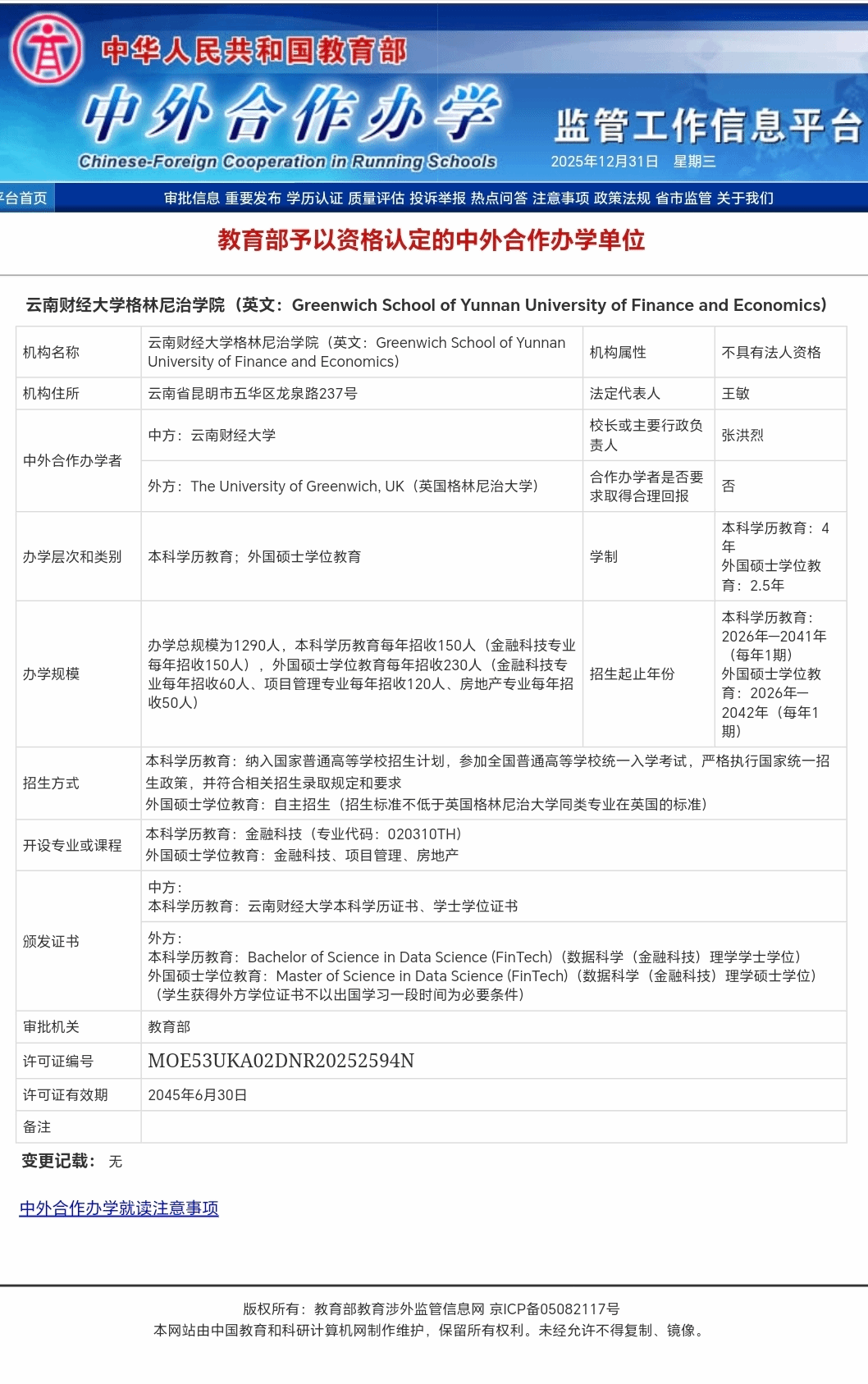 12月31日,教育部中外合作办学监管工作信息平台公布了教育部予以资格认定的中外合作办学单位。WilliamHill官方网站与英国格林尼治大学合作举办的“WilliamHill官方网站格林尼治学院”获批成立,成为WilliamHill官方网站首个中外合作办学机构,标志着学校的中外合作办学实现了从项目到机构的跨越,实现了办学层次、办学规模、招生自主权与国际影响力的多维跃升,为区域高等教育对外开放提供了更加有力的支撑。