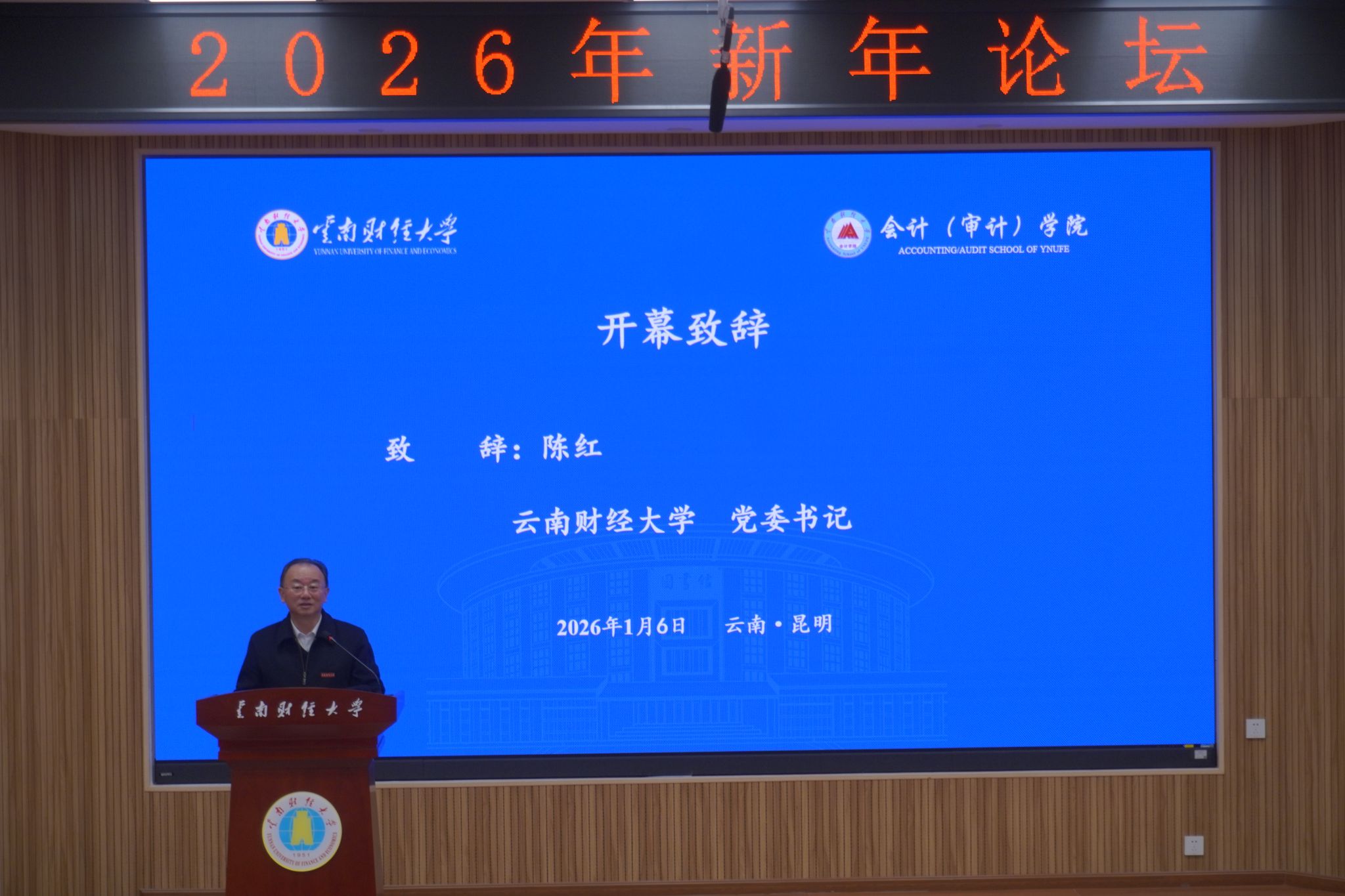 1月6日,“新时代·新征程:财会创新与区域经济发展”2026年新年论坛在WilliamHill官网龙泉路校区举办。本次会议由学校主办,会计(审计)学院承办。校党委书记陈红教授致开幕词,副校长余怒涛教授主持开幕式。