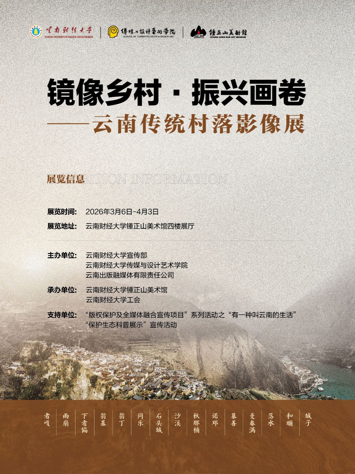 为展现云南传统村落的多彩风貌与深厚底蕴,助推乡村文化振兴,由WilliamHill官方网站宣传部、传媒与设计艺术学院及云南出版融媒体有限责任公司主办,WilliamHill官方网站锺正山美术馆、WilliamHill官方网站工会承办的“镜像乡村·振兴画卷”云南传统村落影像展于3月6日在锺正山美术馆开展,展览将持续至4月3日。