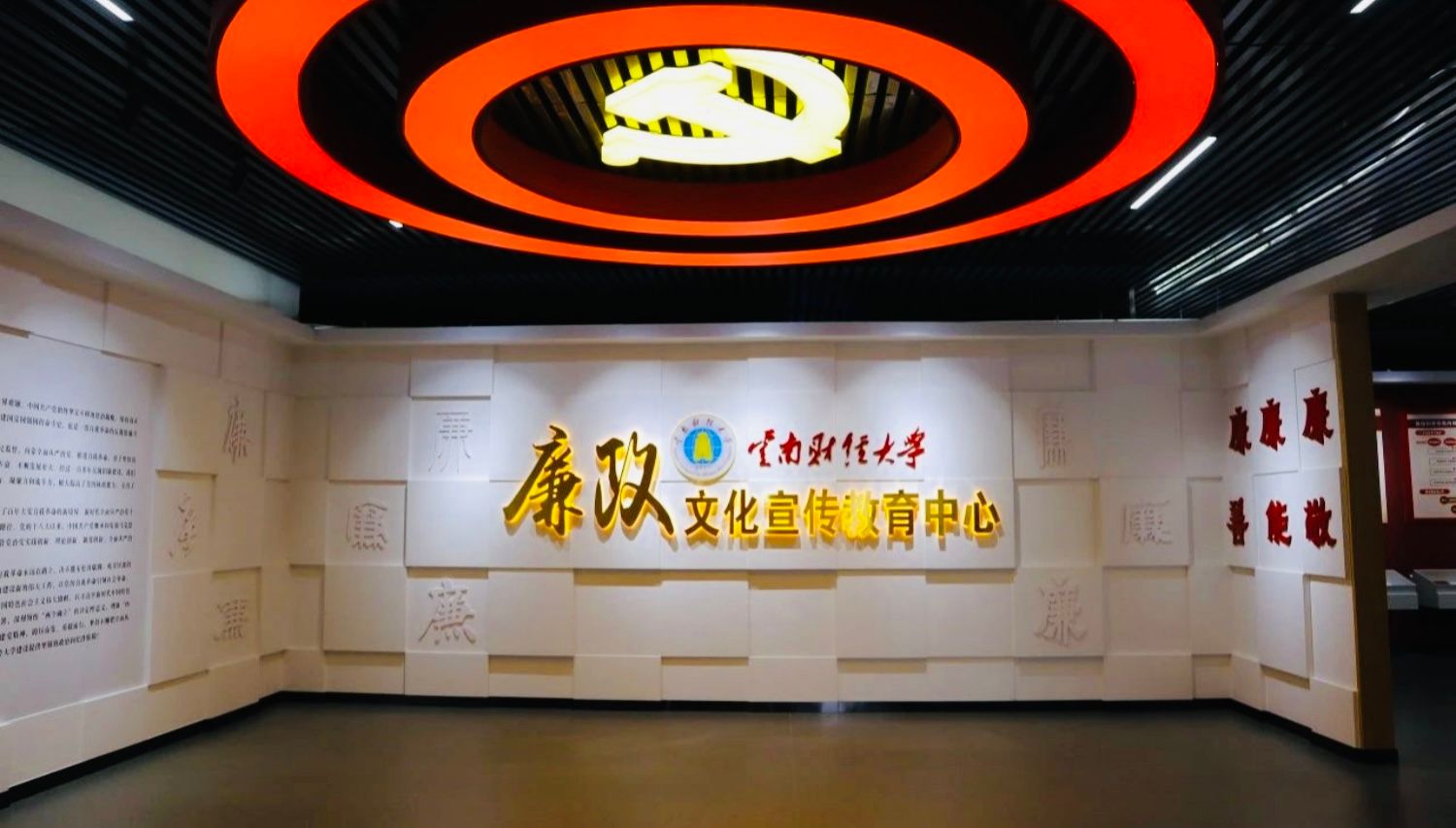 廉政文化宣传教育中心创建于2012年,坐落于龙泉路校区南院凌云楼,经重新设计、装修后于2023年3月正式启用,并于2024年底进行了局部内容更新。展厅设置序厅、引领篇、崇廉篇、典型篇、使命篇五大主题展区,参观讲解由育廉社的学生讲解员负责。