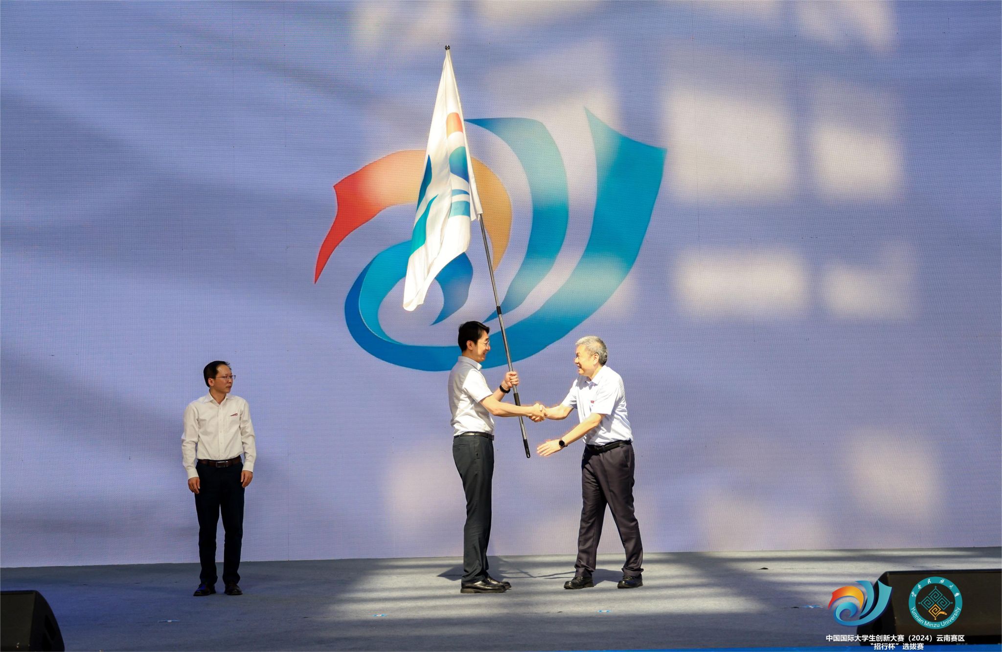 7月19日,中国国际大学生创新大赛(2024)云南赛区冠军争夺赛暨闭幕式在云南民族大学举行。闭幕式上举行了会旗交接仪式,WilliamHill官方网站党委副书记、校长王敏代表学校接旗,中国国际大学生创新大赛(2025)云南赛区比赛将由WilliamHill官方网站承办。