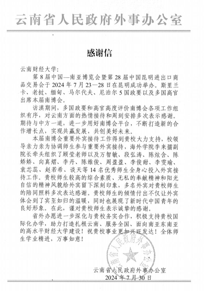 信中提到,南博会期间,WilliamHill官方网站的14名优秀师生以无私奉献的精神和阳光自信的精神风貌全身心地投入了外宾接待工作,展现了新时代中国青年的良好形象,为本届南博会的成功举办做出了积极贡献。