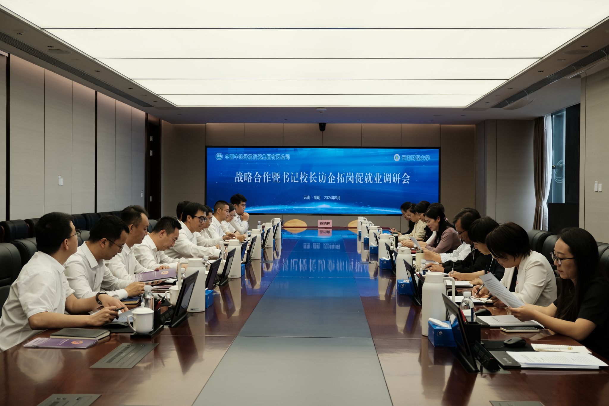 为深入贯彻落实党中央、国务院决策部署,持续优化毕业生就业指导服务,多措并举促进毕业生就业,9月14日下午,副校长彭强率队赴中铁开发投资集团(以下简称“中铁开投”)开展“书记校长访企拓岗促就业”专项行动,与中铁开投总会计师贺传亮等就如何更好地推进人才培养,深化产教融合、校企合作,为毕业生创造更多就业机会等进行深入交流,并举行体验实践基地签约挂牌仪式。