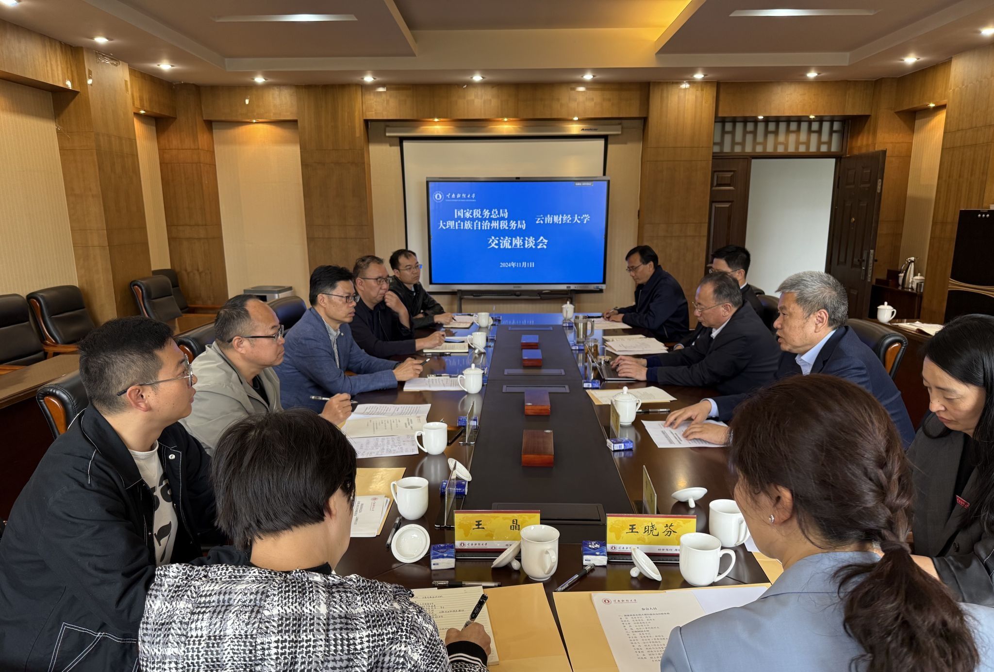 大理州税务局四级高级主办曹玉康、办公室主任黎凯、组织人事科副科长张槐,学校办公室、校友办公室、财政与公共管理学院、会计学院、国际工商学院、国土资源与持续发展研究所(乡村振兴研究院)有关负责人参加交流座谈。