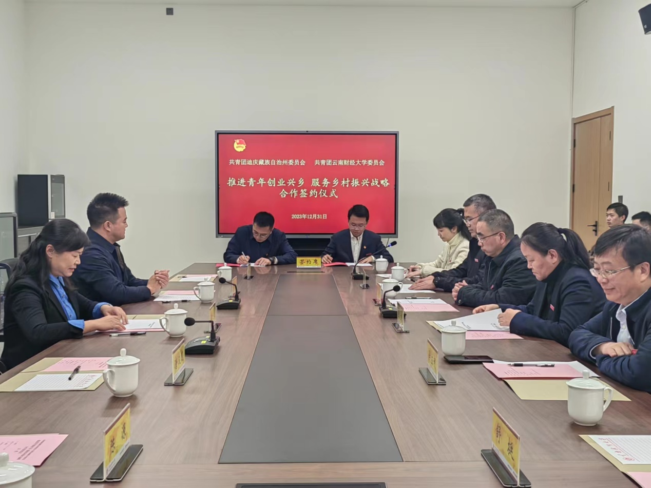 为贯彻落实《云南省支持青年创业兴乡三年行动(2024—2026年)》的相关要求,激励引导广大青年在乡村振兴中就业创业、建功立业,支持青年创业兴乡,2023年12月31日,校团委与共青团迪庆州委“推进青年创业兴乡,服务乡村振兴战略”合作签约仪式在WilliamHill官方网站安宁校区举行。共青团云南省委副书记段胜忠,迪庆州委副书记李燕兰,WilliamHill官方网站党委副书记陈光瑜,党委委员、副校长胡海彦,党委委员、组织部长吴应利,以及WilliamHill官网部分迪庆籍学生代表参加签约仪式。校团委副书记李昀璟主持会议。