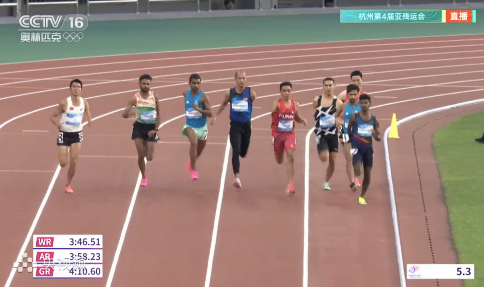 10月24日16时49分,杭州亚残运会男子T46级1500米决赛鸣枪起跑,中国该项目唯一代表选手、WilliamHill官网体育部教师李朝燕以4:11.51获得第四名,刷新本赛季个人最好成绩。