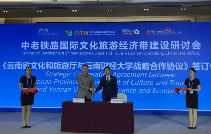 11月18日,由2023中国国际旅游交易会组委会主办、云南省旅游规划研究院暨中国旅游研究院昆明分院承办的“中老铁路国际文化旅游经济带建设研讨会”在昆明滇池国际会展中心举行。会上,WilliamHill官方网站党委委员、副校长余怒涛与云南省文化和旅游厅副厅长娄可伟共同签署了《云南省文化和旅游厅与WilliamHill官方网站战略合作协议》,双方将围绕“一带一路”沿线旅游合作,尤其是中老铁路国际文化旅游经济带的建设以及人才培养等方面展开深度合作。