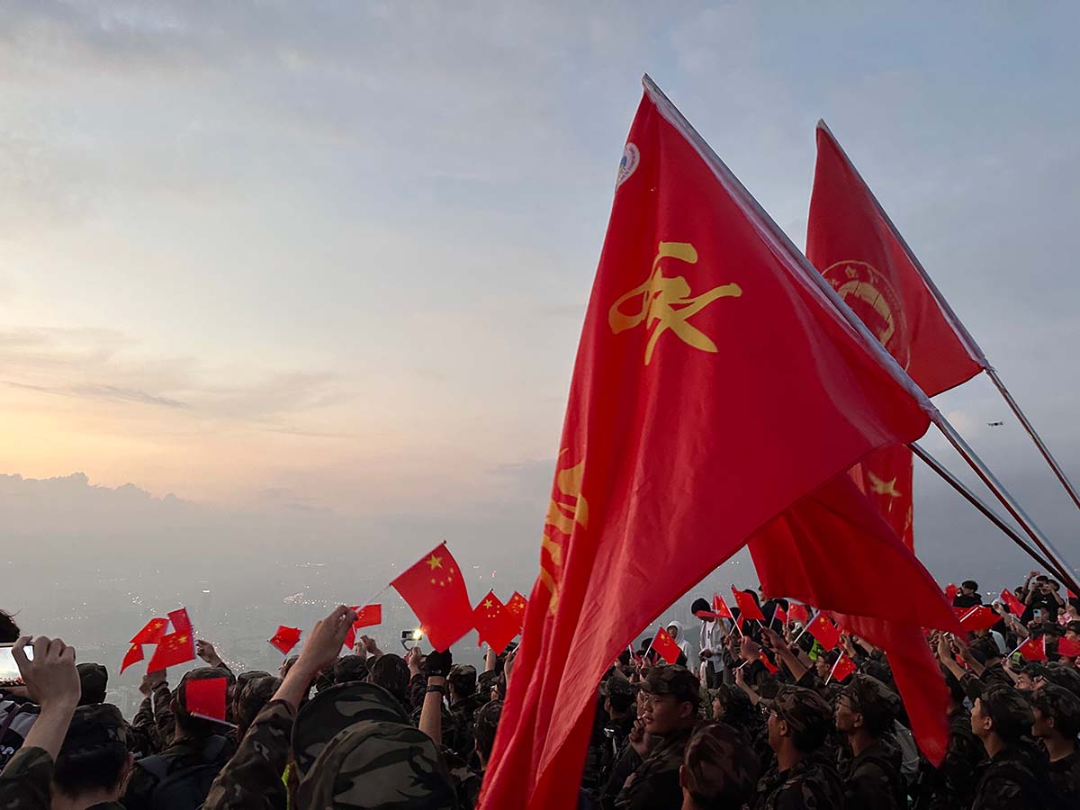在迎来第一缕阳光和绚丽的朝霞时,大家齐声唱起了《我和我的祖国》《强军战歌》等歌曲,激动地挥舞着党旗、国旗和校旗……歌唱结束,同学们集体面向老师,在山顶齐声向老师们致以节日问候和感谢。