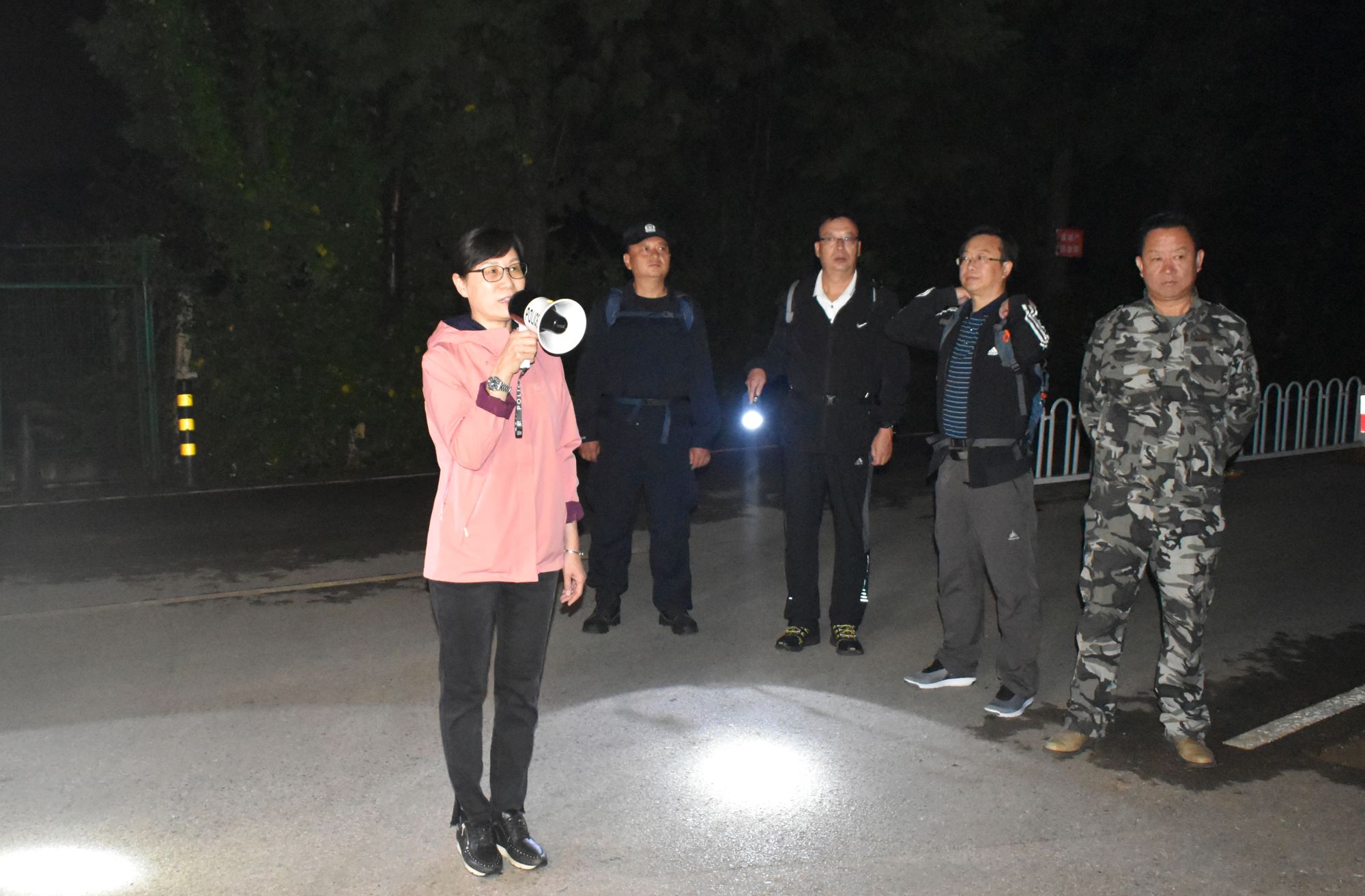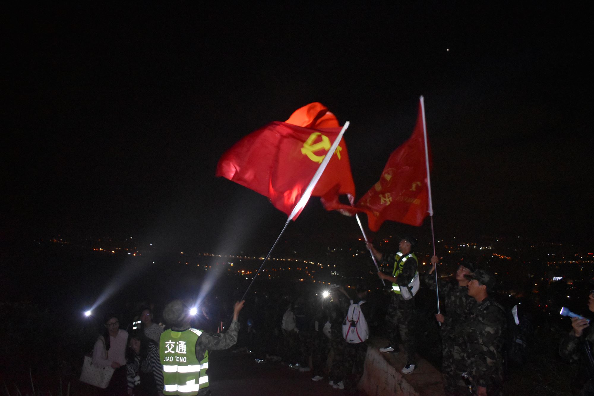 “出发!”随着王建颖老师的一声令下,老师们与军训团的同学们迈着矫健的步伐,整齐有序、斗志昂扬地向着山顶前进。虽然天还未亮,周围漆黑一片,山路也蜿蜒崎岖,但在手电筒的灯光照明下、老师们的鼓励下、教官领唱的歌声陪伴下,同学们斗志昂扬、稳健有序地向山顶攀登,经历1个半小时的努力终于成功登顶。