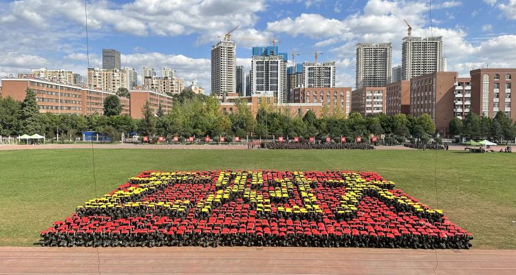 花样方队用红黄颜色彩纸描绘出党徽、“1927”、“2023”、“96”等有意义的数字以及歼-20战斗机、东风洲际战略核导弹等大国重器图案,并伴随歌曲《中国人》旋律,用手语操进行表演,传递了云财学子怀揣梦想、奋勇拼搏的使命担当和经世济民的家国情怀。