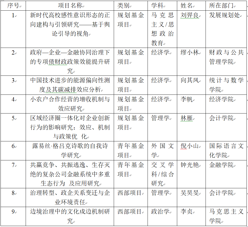 从学科分布来看,马克思主义/思想政治教育1项,外国文学1项,经济学3项,管理学2项,交叉学科/综合研究1项,政治学1项。从单位分布看,发展规划处1项,会计学院2项,马克思主义学院1项,国际语言文化学院1项,财政与公共管理学院1项,统计与数学学院1项,经济学院1项,金融学院1项。