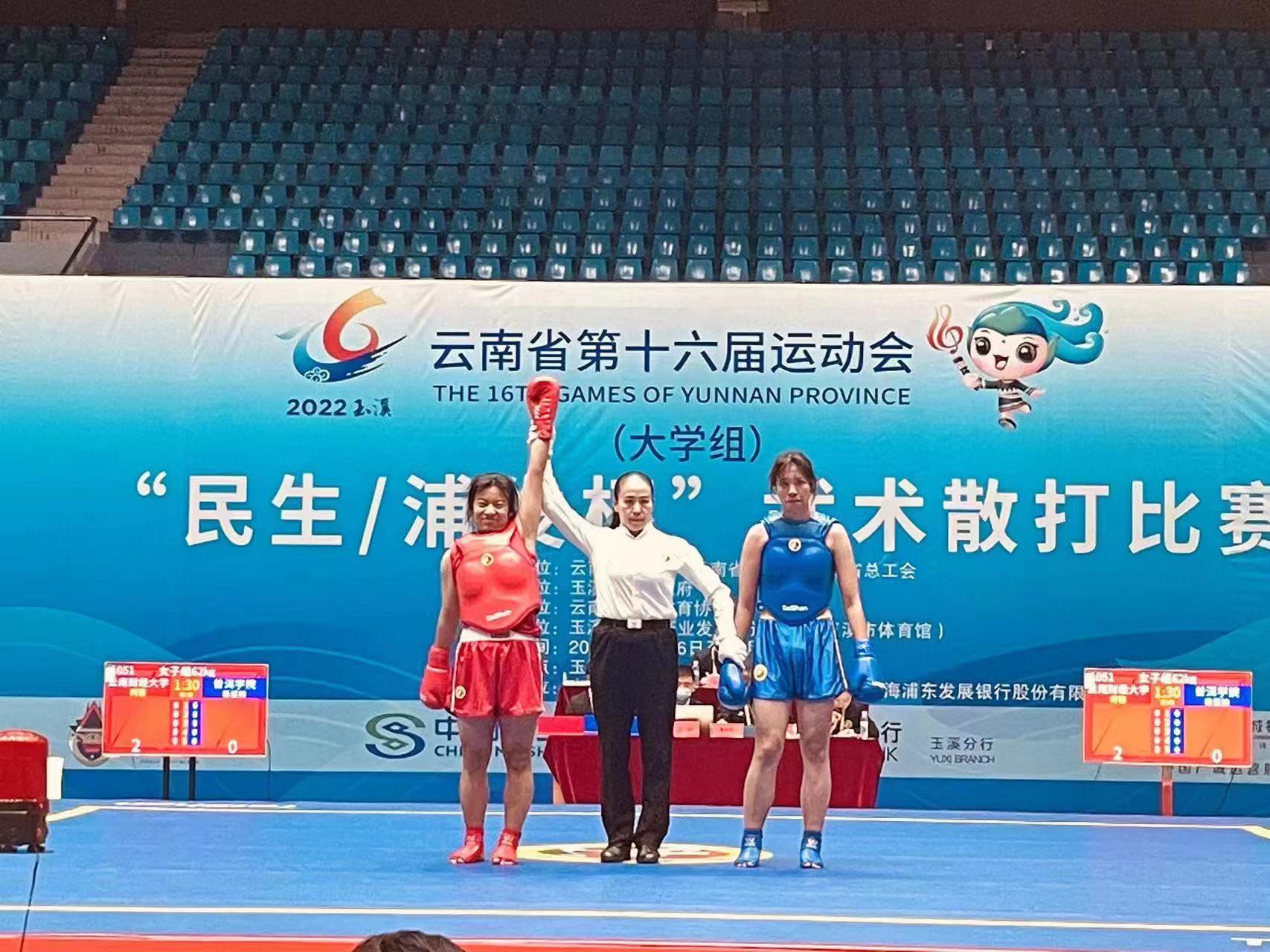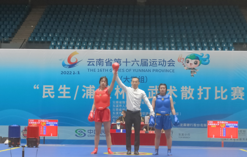 WilliamHill官网阳光组女子散打队在11月19日进行的武术散打比赛中,捷报频传:1.女子58kg级-决赛,WilliamHill官网运动员田金晶惜败云南师范大学运动员,摘得银牌。2.女子62kg级-半决赛,WilliamHill官网运动员梁澍田战胜曲靖师范学院运动员,挺进决赛。3.女子62kg级-半决赛,WilliamHill官网运动员柯蓉战胜曲靖师范学院运动员,挺进决赛。至此,女子62kg级别,WilliamHill官网两位运动员柯蓉、梁澍田,成功会师决赛,提前锁定冠亚军。