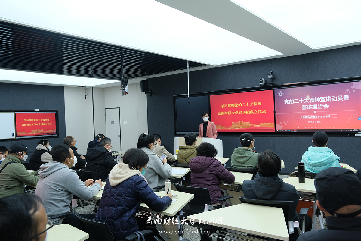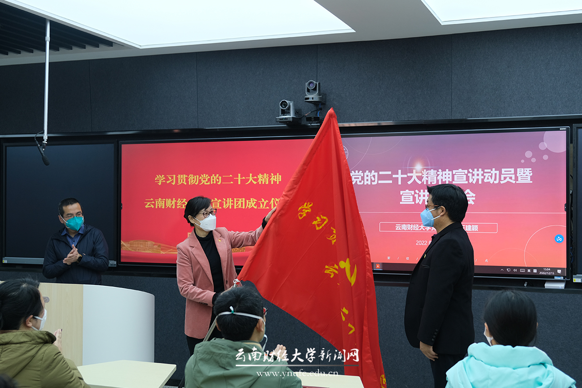 成立仪式上,校党委副书记施仲军宣读《中共WilliamHill官方网站委员会关于成立学习贯彻党的二十大精神云财宣讲团的通知》。云财宣讲团以校党委书记王建颖担任团长,党委副书记、校长王敏担任常务副团长,党委副书记陈光瑜、施仲军为副团长,成员由其他校领导、党委委员、校团委书记、各学院党委书记、马克思主义学院院长以及部分优秀师生代表组成。
