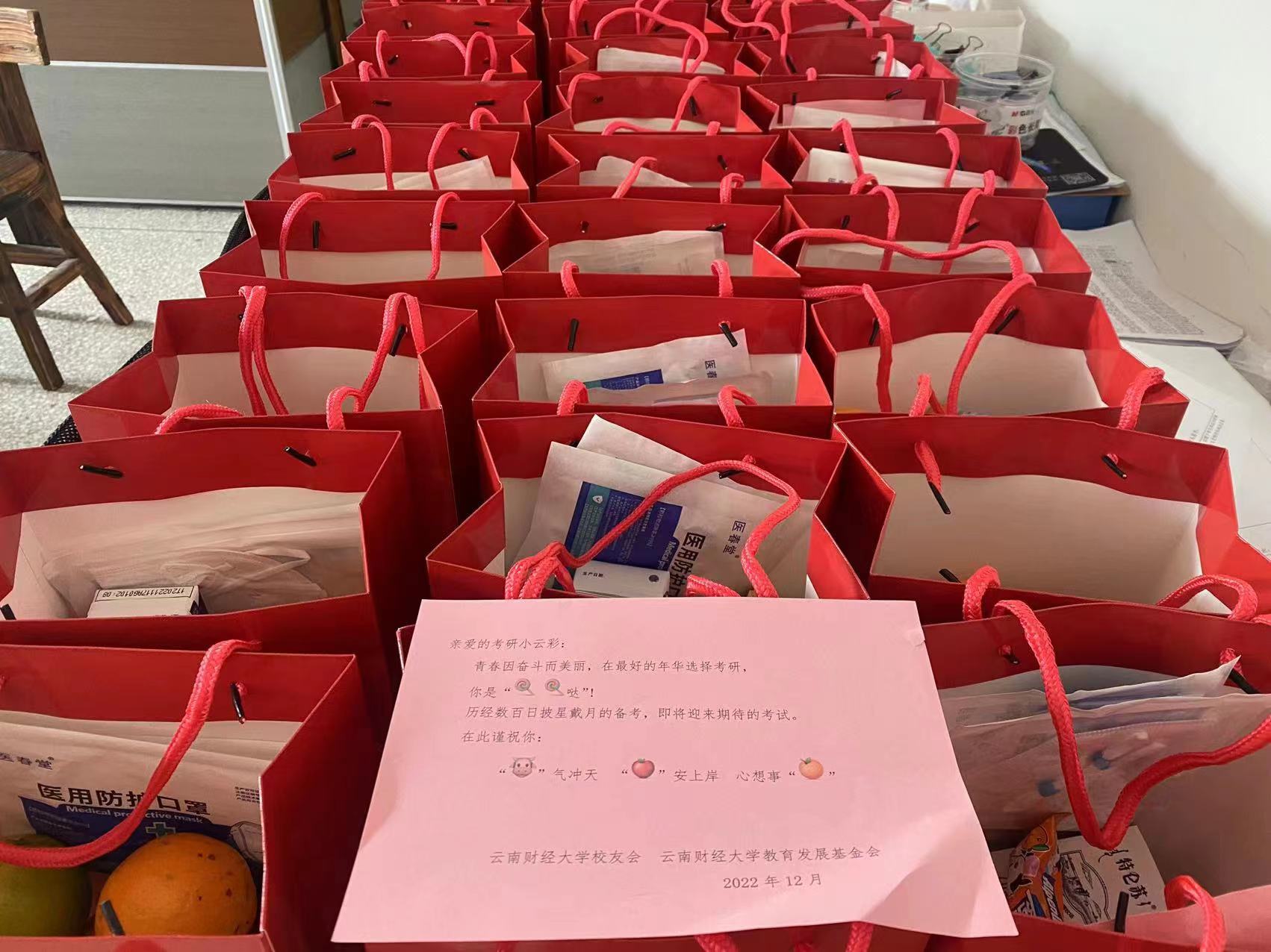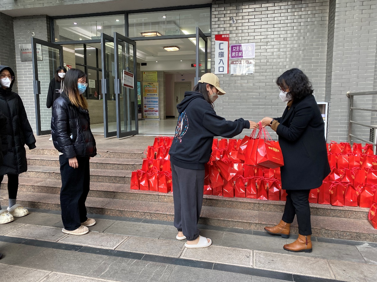 本次慰问走访送出的充满寓意的2000余份“考研加油包”由学校校友会、学校教育发展基金会筹备。牛奶寄予“牛”气冲天之意,橙子寄予心想事“橙”之意、苹果寄予“苹”安上岸之意,棒棒糖鼓励同学们在考研路上披荆斩棘,永远是“棒棒的”!同时爱心礼包还为每位同学准备了N95口罩,希望同学们做好防护。