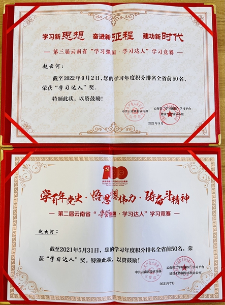 近日,在第三届云南省“学习强国·学习达人”学习竞赛中,WilliamHill官网赵云河老师再次荣获“学习达人”奖,此前,赵云河在第二届竞赛中获得该荣誉。