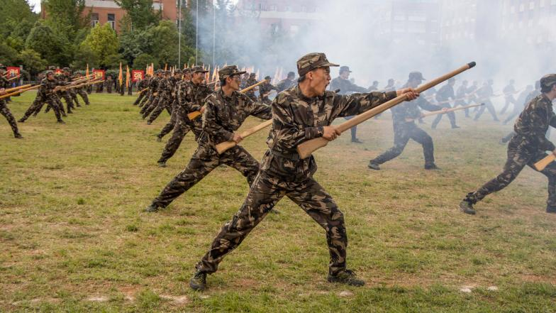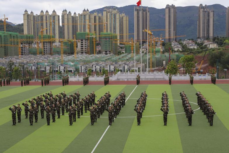 在军事科目汇报表演环节,刺杀操方阵中一个个铁血男儿精神抖擞、军容严整,一势一动之间尽显豪气;伴随着“杀——杀——杀”声响,军体拳方阵亮相,铁血男儿们出拳刚劲有力、节奏分明,一招一式展现出坚韧不拔、勇敢顽强的战斗作风;捕俘刀女子小队出刀迅猛、口号铿锵有力,刀起刀落间展现出巾帼不让须眉的气概;队列展示方阵在“稍息、立正、敬礼、蹲下、起立……”口号的指挥下动作整齐划一,展现出过硬的队列素质;战术小队在烟雾和鞭炮声中震撼出场,在手语指挥下观察左右敌情并摸索前进、摸爬滚打中尽显军人的刚劲坚毅;令旗方阵挥舞着手中的旗帜,旗帜所指之处是祖国的寸寸河山,心之所向是祖国的万里疆土;花样方队用手中的彩纸描绘出党旗、和平鸽、中国地图、“共迎二十大、一起向未来”、“我爱财大”等图案,在“1921”“1949”“2017”“2021”“2022”“2049”等标志性年份的图案变换中,展示出国家发展历程,并喊出“跨越百年,逐梦千秋”“勇担时代重任,奉献火红青春”“团结奋进,振兴中华”的口号;最后的手语操表演《国家》传递了云财学子经世济民的家国情怀。
