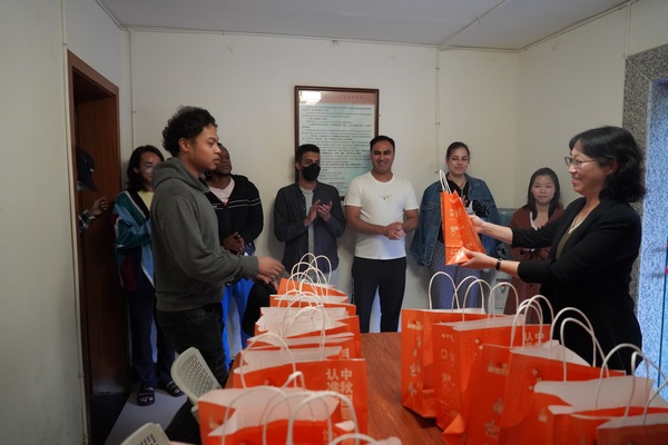 在涵华苑一楼学生活动室,旷锦云与国际学生亲切交谈。她关切询问了国际学生的来源国以及在校学习、生活状况,对国际学生努力学习、遵守纪律、积极配合抗疫的表现给予了充分肯定。同时,她向国际学生讲述了我国中秋佳节的美好寓意和传统习俗,给在场的国际学生一一发放了节日慰问礼品,并勉励同学们继续努力学习,既要学好专业知识,更要全面深入地学习和了解中国文化,将来为中外文化交流作出更多更大的贡献。