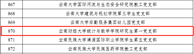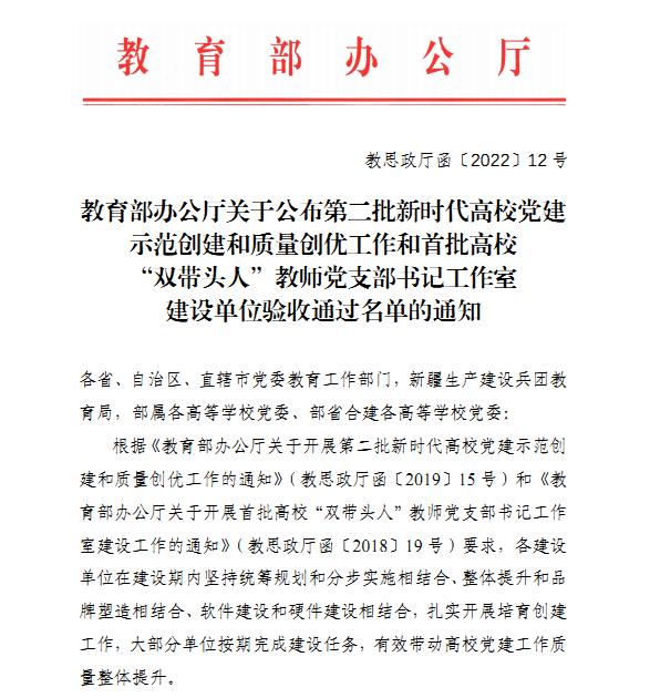 近日,教育部办公厅印发《关于公布第二批新时代高校党建示范创建和质量创优工作和首批高校“双带头人”教师党支部书记工作室建设单位验收通过名单的通知》,WilliamHill官方网站统计与数学学院研究生第一党支部在2年多的示范创建和质量创优建设期内,按照教育部和中共云南省委教育工委的部署要求,在学校党委的坚强领导,和组织部、学院党委的具体指导下扎实开展培育创建工作,各项创建任务均已按期完成,经支部、学院党委、学校党委组织部对标自查总结,省委教育工委组织部把关审核、教育部思想政治工作司审查、教育部政府门户网站公示,顺利通过教育部第二批新时代高校党建示范创建和质量创优工作建设单位验收,正式成为教育部命名的“全国党建工作样板支部”。