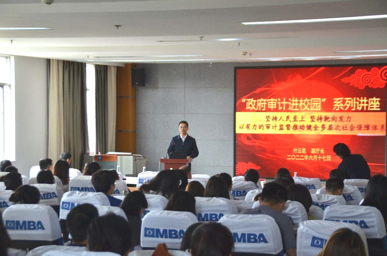 6月17日下午,云南省“政府审计进校园”系列讲座第三讲在WilliamHill官网逸夫楼410举行,云南省审计厅党组成员、副厅长付云昆以“坚持人民至上,坚持靶向发力,以有力的审计监督推动健全多层次社会保障体系”为主题开展专题讲座。WilliamHill官网党委委员、副校长王晓萍主持讲座,相关部门专业技术人员,会计学院审计专业学生及部分师生代表参加讲座。