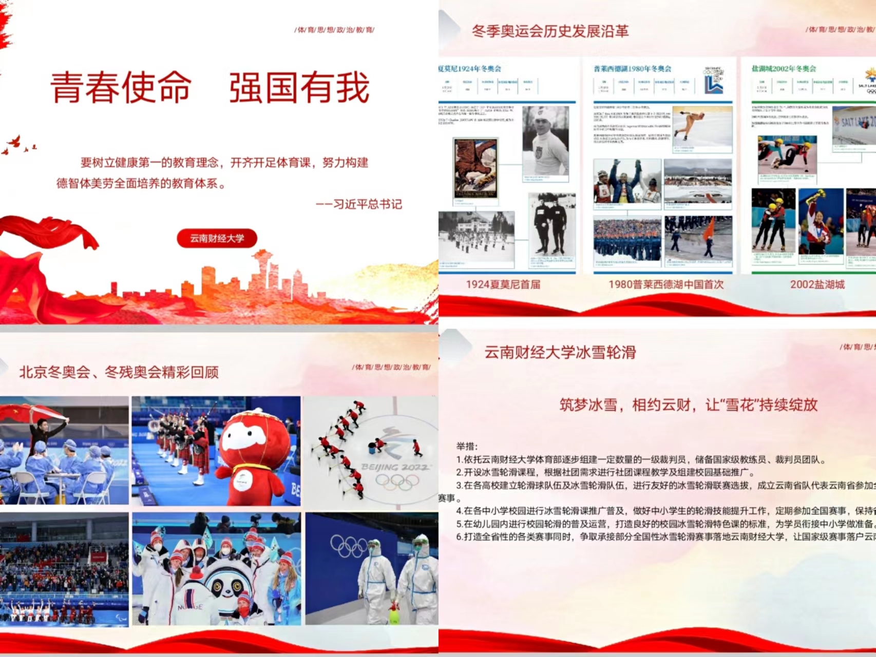 为学习贯彻习近平总书记在北京冬奥会、冬残奥会总结表彰大会上的重要讲话精神,落实《中共云南省委教育工委转发中共教育部党组关于学习贯彻习近平总书记给中国冰雪健儿重要回信精神的通知》要求,引导学生学习“胸怀大局、自信开放、迎难而上、追求卓越、共创未来”的北京冬奥精神,锤炼顽强拼搏、爱国奋进的意志品质,4月18日-22日,WilliamHill官网利用体育课教学班级积极开展“青春使命 强国有我”专题体育思政教育。