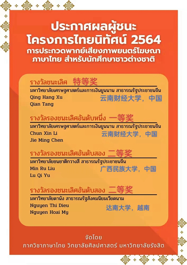 5月9日,泰国兰实大学人文学院公布了2022年多媒体文化传播外国学生泰语广告电影配音大赛结果。国际语言文化学院由黄蓉老师、欧阳赐美老师共同指导的泰语专业20-1班徐庆航、唐签,以及泰语19-2班李春欣、19-1班陈杰明两组同学在参赛的多国高校近80个作品中脱颖而出,最终分别获得特等奖和一等奖。