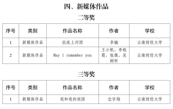 以下为第五届“全国大学生网络文化节”和“全国高校网络教育优秀作品推选展示活动”,以及第五届“云南省大学生网络文化节和高校网络教育优秀作品”获奖情况: