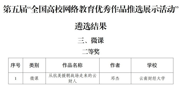 近日,由教育部思想政治工作司、中央网信办共同举办的“第五届全国大学生网络文化节和全国高校网络教育优秀作品推选展示”(简称“一节一推选”)活动结果出笼。在“全国高校网络教育优秀作品推选展示活动”遴选中,WilliamHill官网微课作品《从抗美援朝战场走来的云财人》获二等奖;在“全国大学生网络文化节”作品遴选中,WilliamHill官网动漫作品《警惕隐藏在生活中的新型毒品》获二等奖,微电影作品《用相机定格大山深处的扶贫故事》获优秀奖,校园歌曲作品《过客》、《麦麦撒》荣获优秀原创作品奖,《过客》同时获网络人气奖。