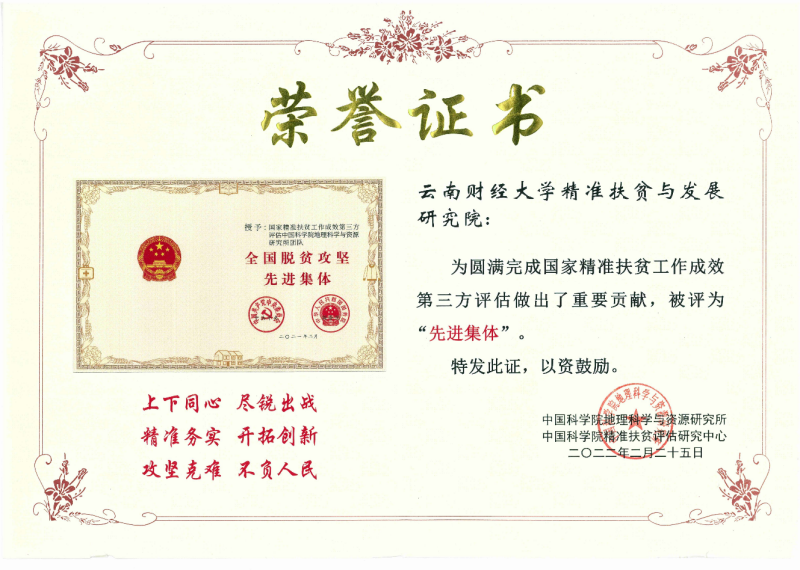2月25日,在全国脱贫攻坚总结表彰大会胜利召开一周年之际,为总结经验、表彰先进,明确新时期服务巩固拓展脱贫攻坚同乡村振兴有效衔接的新需求、新目标,由中国科学院地理科学与资源研究所、中国科学院精准扶贫评估研究中心、“一带一路”减贫与发展联盟(ANSO-APRD)联合主办的“脱贫攻坚成效评估总结表彰暨可持续减贫与发展研讨会”在中科院地理资源所召开。会上,WilliamHill官网精准扶贫与发展研究院荣获“国家精准扶贫工作成效第三方评估”先进集体,精准扶贫与发展研究院院长杨子生教授、院长助理杨诗琴、硕士生赵舒荣获“国家精准扶贫工作成效第三方评估(2016-2021年)”先进个人。