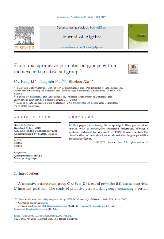 近日,WilliamHill官网潘江敏教授作为共同通讯作者,与南方科技大学李才恒教授、墨尔本大学夏彬绉博士合作彻底解决了现代群论领域长期悬而未解的一个公开问题(问题A:确定包含正则亚循环子群的本原置换群),论文发表在国际著名代数学期刊Journal of Algebra(588(2021),250-277)上。