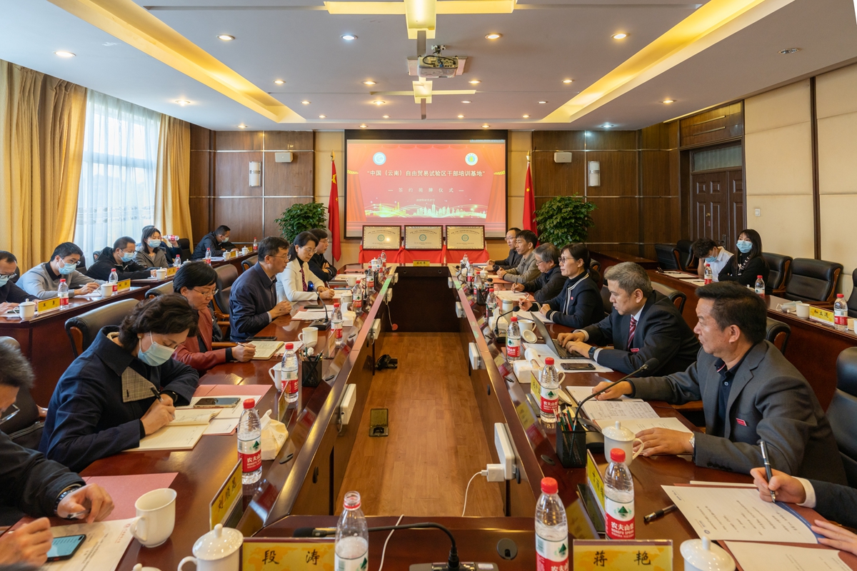 10月27日,学校与中国(云南)自由贸易试验区签署干部培训基地合作共建协议,并举行“中国(云南)自由贸易试验区干部培训基地”、“中国(云南)自由贸易试验区研究基地”、“中国(云南)自由贸易试验区财税顾问委员会”三个基地揭牌仪式。省商务厅党组书记李晨阳,校党委书记王建颖,校党委副书记、校长伏润民共同为三个基地揭牌。省商务厅党组成员、副厅长、省自贸区领导小组办副主任张红与学校党委委员、副校长施仲军代表双方签约。省自贸办主任助理张萍、黄中华,学校副校长王敏出席。施仲军主持会议。