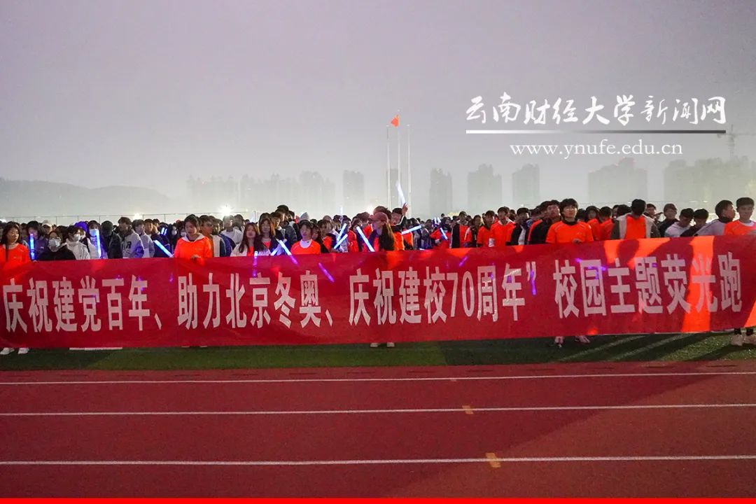 作为校运动会的一个子活动,本次荧光夜跑以“庆祝建党百年、助力北京冬奥、庆祝建校70周年”为主题,旨在贯彻落实党的教育方针,倡导德智体美劳“五育并举”,培养云财学子爱党、爱国的坚定信念和奋发向上的精神风貌。