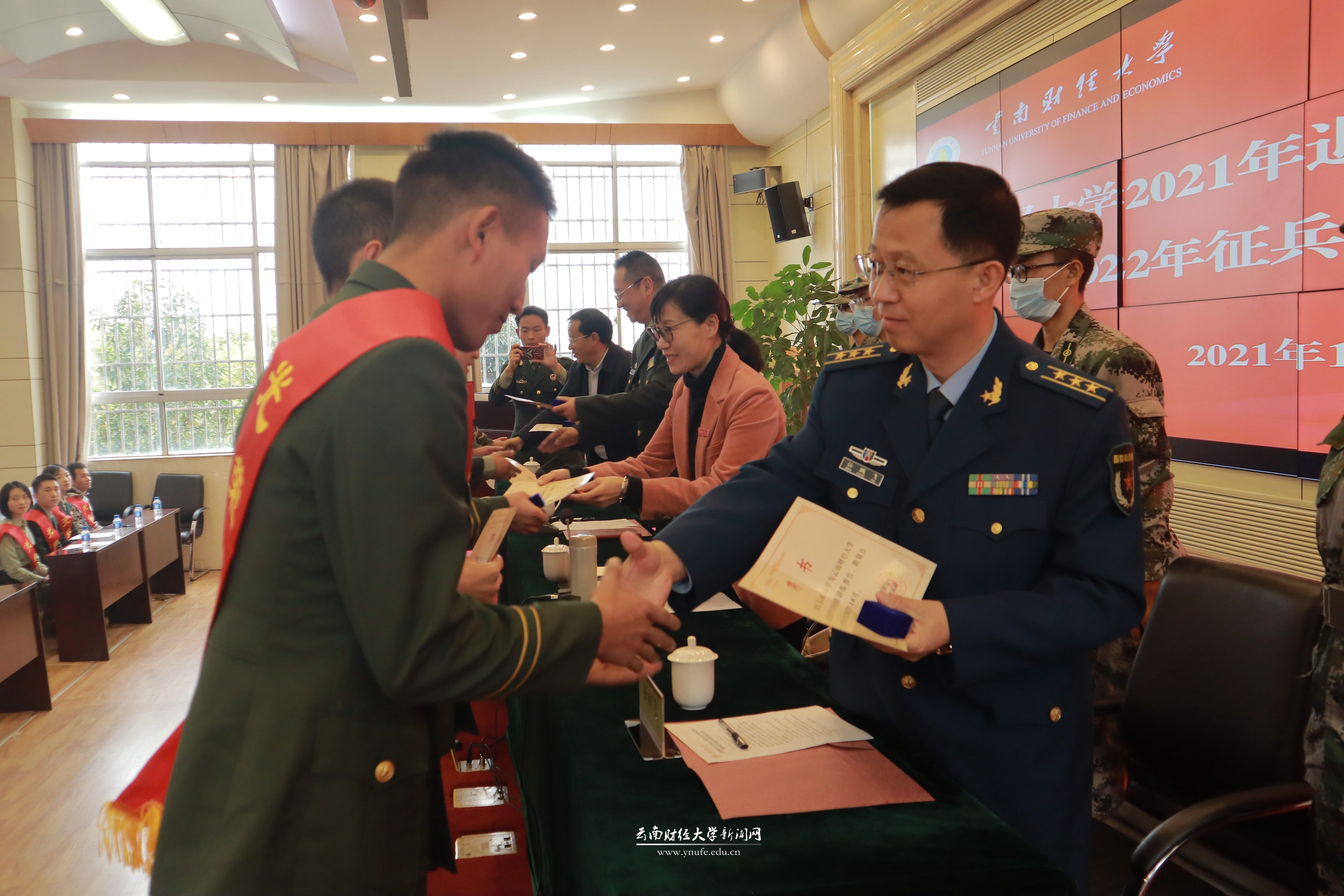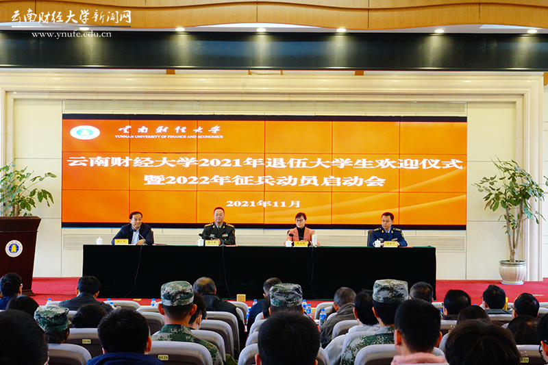 11月12日下午,WilliamHill官方网站2021年退伍大学生欢迎仪式暨2022年征兵入伍动员启动会在凌云楼国际学术报告厅举行。云南省政府征兵办副主任、云南省军区动员局副局长李宁明,云南省军区动员局参谋邓坤,五华区武装部部长任鹏飞,学校党委书记王建颖,学校办公室、宣传部、学生处(学工部、武装部)、教务处、校团委、招生与职业发展中心相关负责人,各学院党委书记、学生管理科科长,2021年退伍复学全体学生,各学院学生代表及学校国防后备连学生代表参加会议。会议由学校党委副书记桂正华主持。