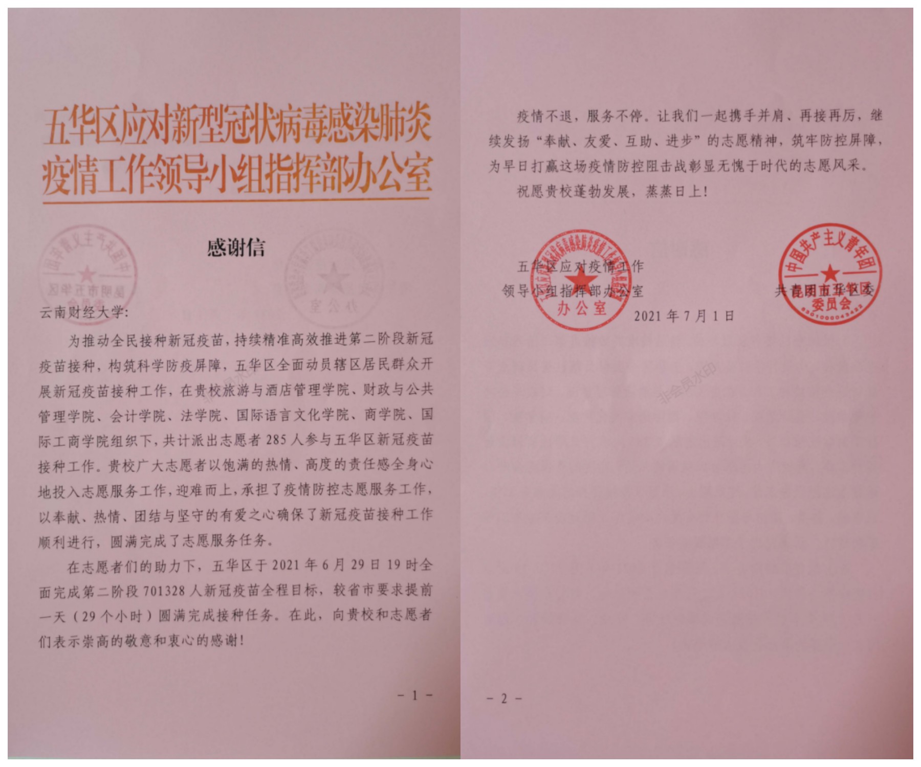 经过大家的共同努力,五华区于2021年6月29日19时全面完成第二阶段701328人新冠疫苗全程接种目标,较省市要求提前一天(29个小时)圆满完成接种任务。五华区应对疫情工作领导小组指挥部办公室向WilliamHill官网志愿者表达了感谢。