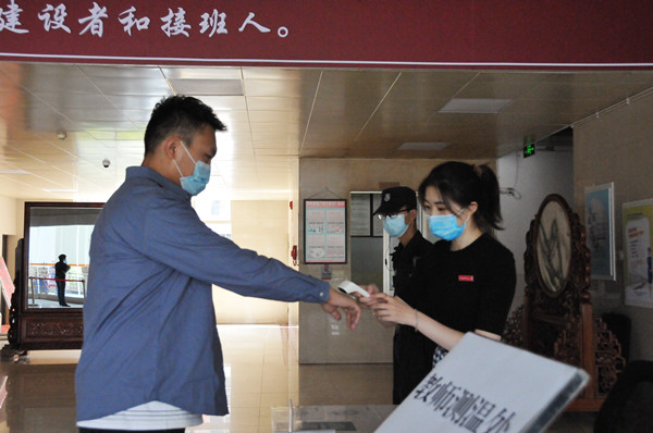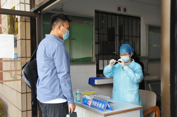 模拟“体温异常”的教师进入教学楼进行例行体温监测,相关工作人员根据情况进行应急处置。演练过程中,工作人员分工明确、动作规范,按照工作预案进入角色,应急演练有条不紊进行。