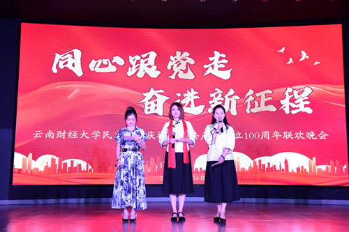 晚会由农工党支部、民进支部和致公党支部三位教师代表主持。文艺晚会在8位民主党派主委、负责人和代表朗诵的《沁园春•雪》中拉开帷幕。民建支部合唱《没有共产党就没有新中国》及诗朗诵《唱支山歌给党听》;民革支部藏族舞《玛吉阿米》和独唱《敖包相会》;民盟支部旗袍秀《歌唱共产党》及健美操《中国喜事》;民进支部诗朗诵《盛世中华》及英文诗朗诵《沁园春·雪》;致公党支部诗朗诵《向中国共产党致敬》和歌舞《没有共产党就没有新中国》;农工支部朗诵《追梦》及合唱《我的祖国》;九三学社支部诗朗诵《沁园春·长沙》《水调歌头·游泳》及小合唱《团结就是力量》等16个节目。精彩纷呈的节目饱含对中国共产党成立100周年的真诚祝福,表达了各党派与中国共产党荣辱与共、肝胆相照的情感与坚定信念。