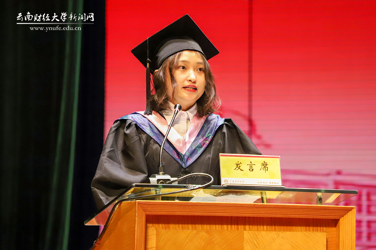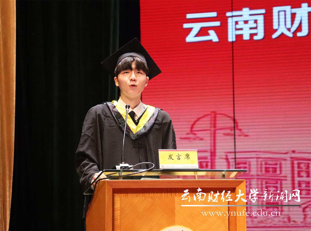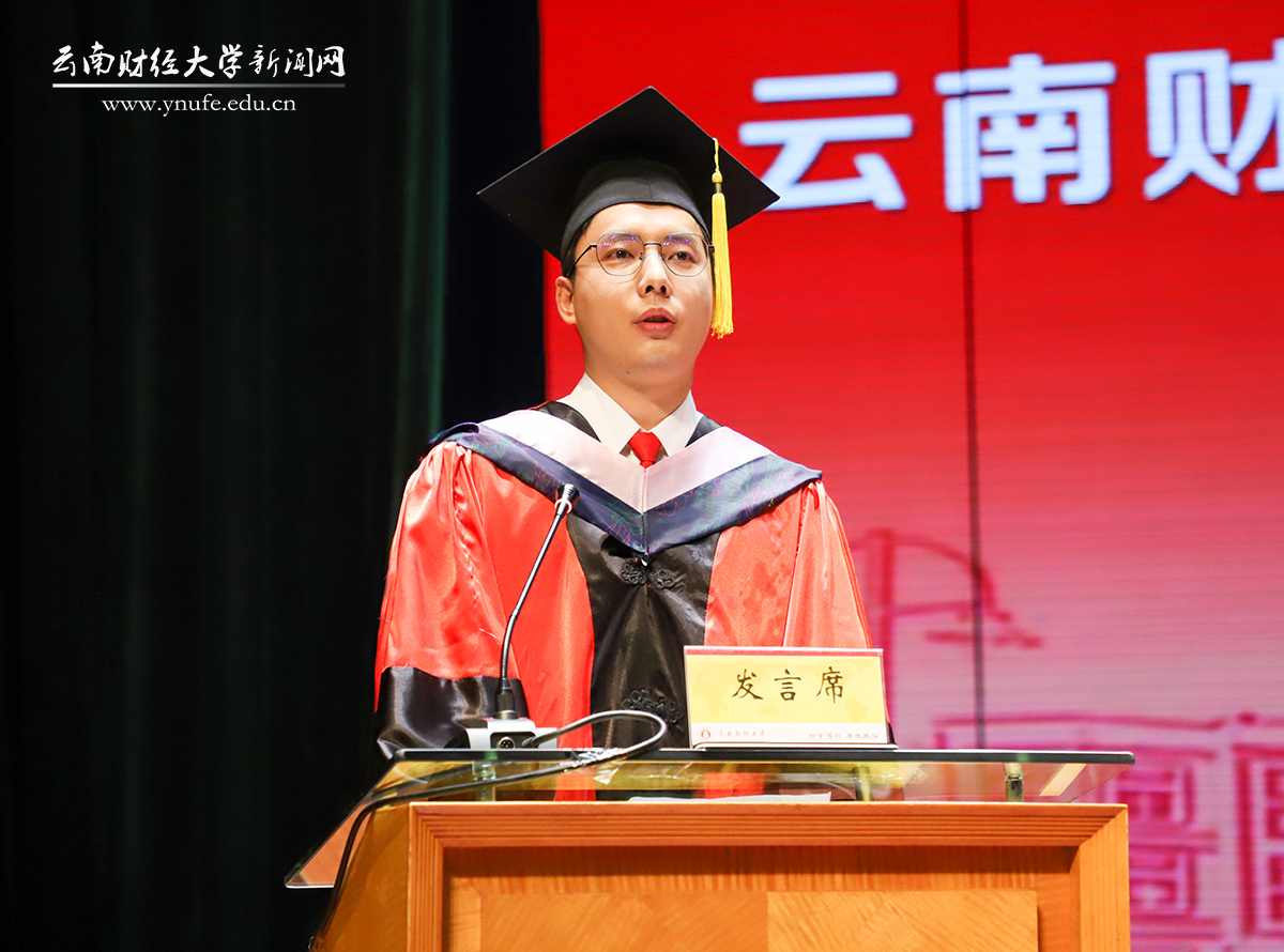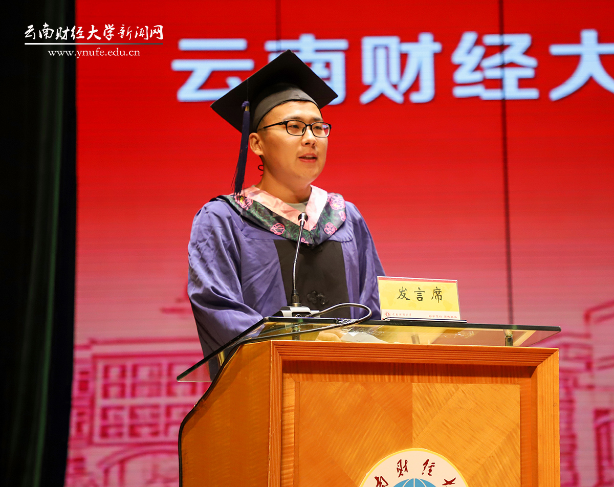 “三年前,我在云财门前驻足、仰望,无限憧憬心中的诗和远方,后来我在这里有了属于自己的故事。”财政与公共管理学院裴瑞同学作为研究生代表发言。他表示,一路走来,每一个坚定的脚印都让自己变得更加从容成熟、收获满满。
