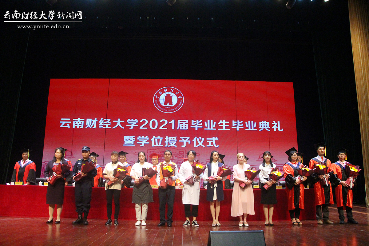 党委副书记谢昌浩,党委委员、副校长王晓萍,副校长彭强,党委委员、纪委书记陈光瑜,党委委员、副校长王敏,党委委员、副校长旷锦云,党委委员、副校长施仲军出席。作为教职工代表,博士研究生导师卢启程、硕士研究生导师杨国辉、本科生学业导师王海燕、辅导员黄娅雯、外籍教师Rouhieh(罗西)、班主任刘诗琦、医务工作者王兆勤、绿化工作人员普明强、食堂员工翟萍、保洁员徐琼仙、安保人员岑泽俊、宿舍管理员白雪静受邀在主席台就坐。党委副书记桂正华主持典礼,2021届毕业生代表到现场参加典礼。