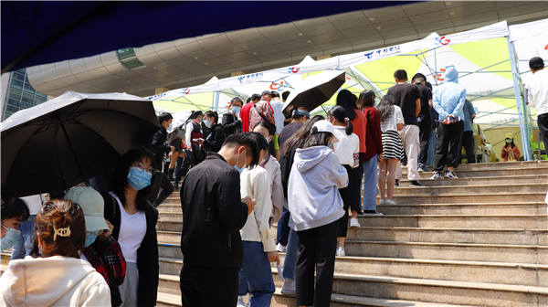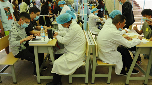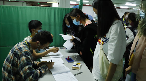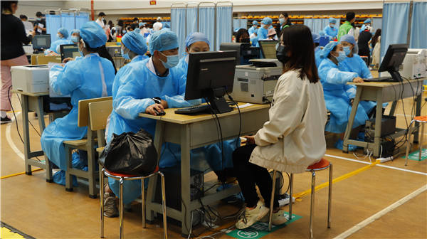 (前来接种疫苗的师生正在排队登记)