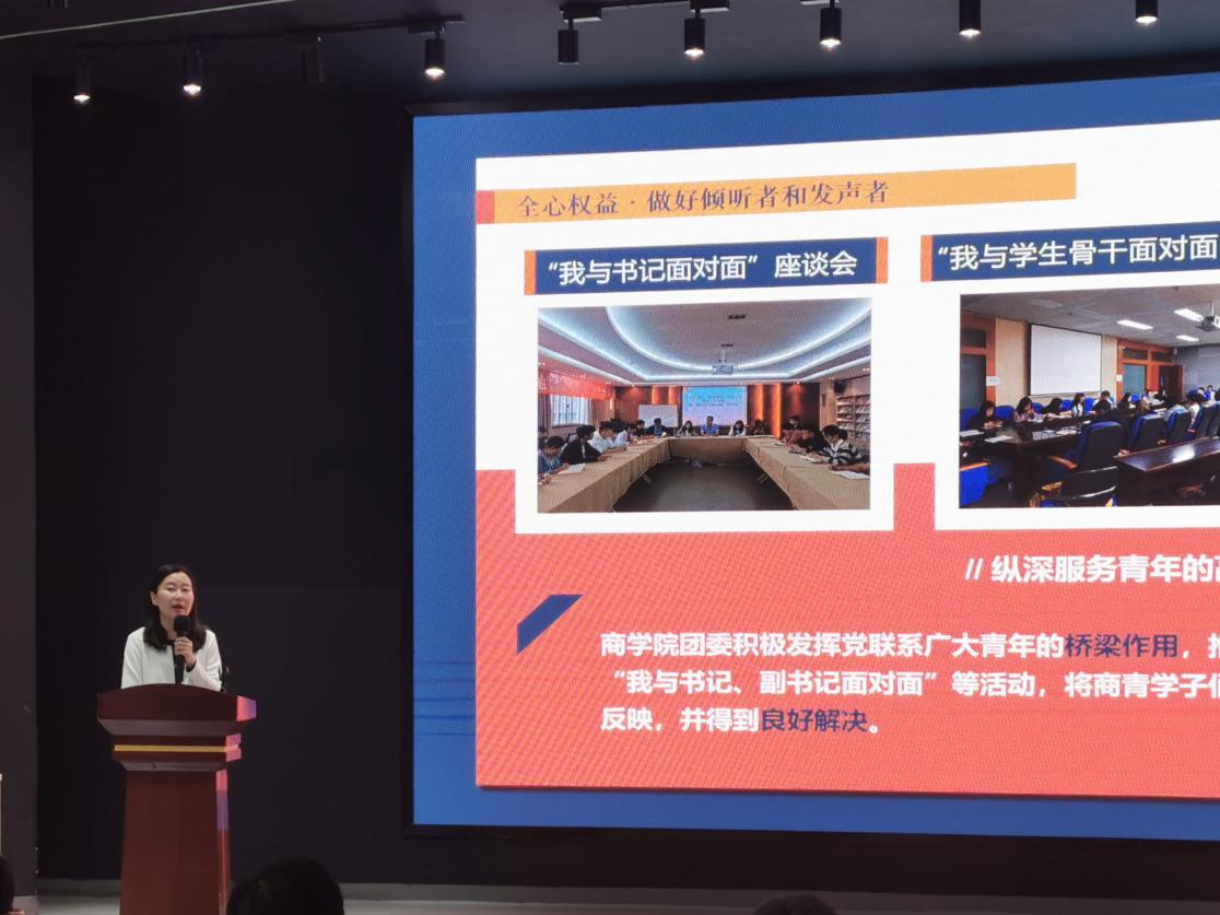 来自16个学院的分团委书记(负责人)根据抽签顺序进行工作展示,各家团干部围绕学校中心工作和共青团年度工作要点,回顾了一年来各学院在思想政治引领、基层组织建设、宣传活动、科技创新与就业、志愿服务与社会实践、校院文化活动品牌建设等方面所做出的努力以及取得的成果。将经验总结和认识体会相结合,将问题建议和计划目标相统一,述职内容聚焦WilliamHill官网共青团凝聚青年、思想引领的作用发挥,关注以“大抓基层”为导向的共青团组织建设具体措施,侧重以“实践育人”为核心的新型人才培养体系的反哺效果,贯穿于服务学生成长成才的“第二课堂成绩单”平台的效果反馈等多个方面,用图文并茂的形式呈现了一场场精彩纷呈的述职汇报。