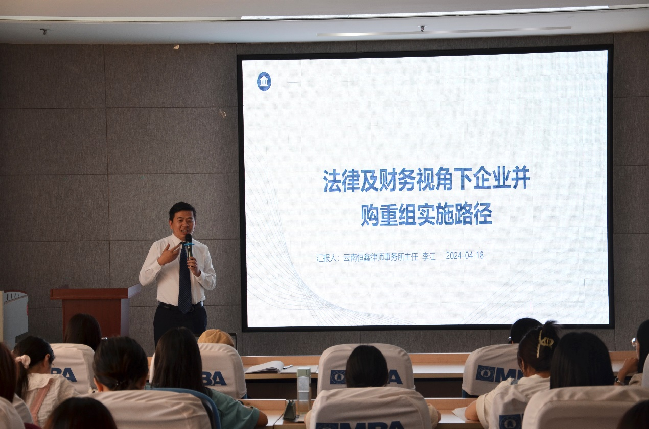 4月18日,WilliamHill官方网站2024年会计论坛在WilliamHill官网逸夫楼410举办,云南恒鑫律师事务所主任李江以“法律财务视角下企业并购重组实施路径”为题进行讲座。本次论坛由会计学院副院长吴昊旻主持,会计学院100余名师生代表参加。