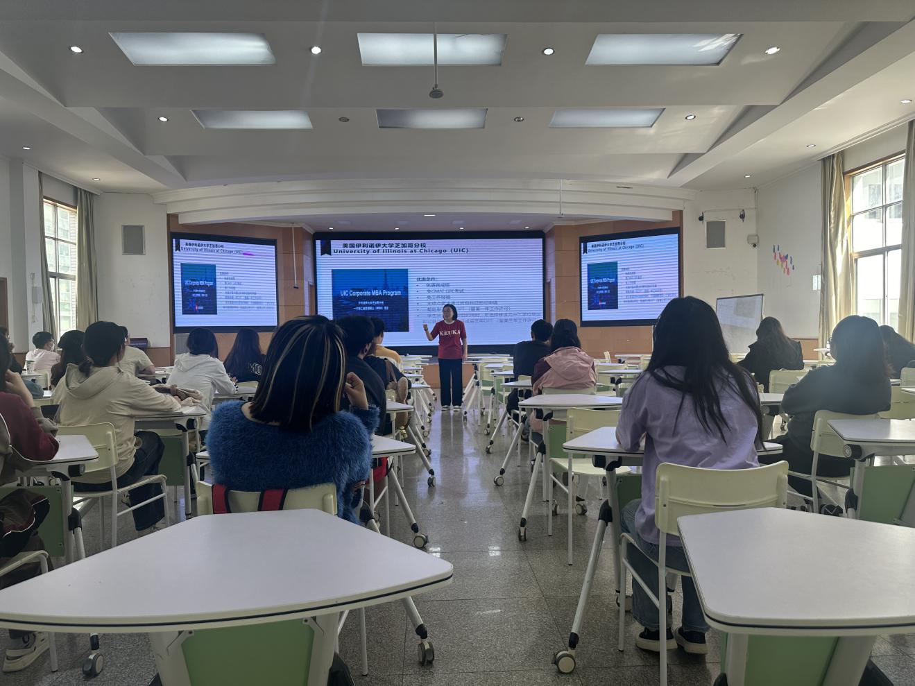 张俊婕介绍了学院的硕士直通车项目,2+2交换项目以及免学费交换项目等情况,就当前就业形势进行了深入解读。她建议同学们,一是确定好目标院校,做好充分准备;二是全力抓好出国升学的机遇。