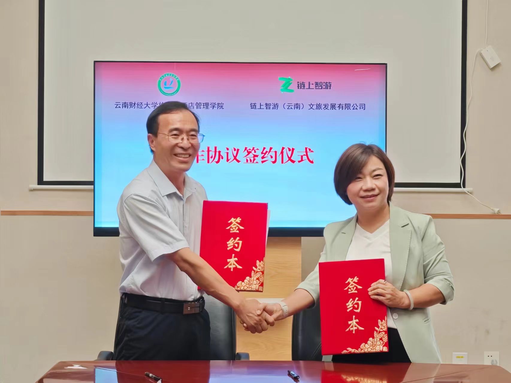 学院院长晏雄代表学院与链上智游(云南)文旅发展有限公司董事长姜凌共同签订了合作协议,启动数字文旅精英人才培联合培养工作,推动建设“数智文旅现代产业学院”。
