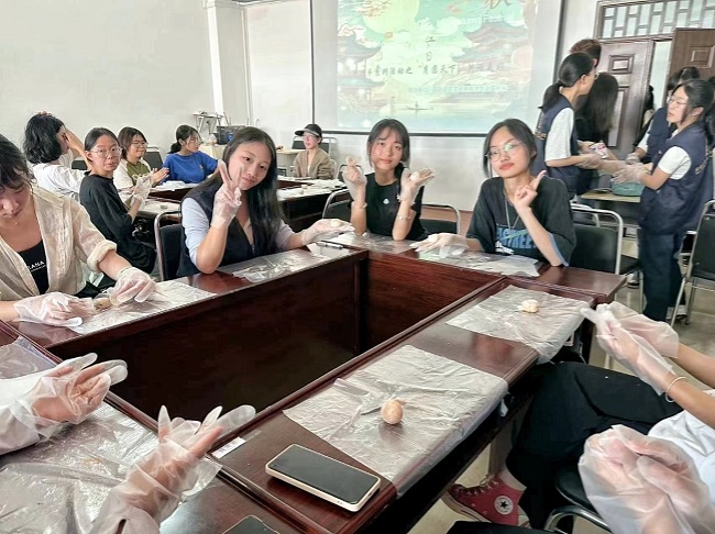 活动开始前,大家一起观看了有关中秋节历史和传统习俗的视频,进一步了解了中秋节所承载的民族文化印记。在“中秋传说有奖问答”环节,志愿者们介绍了桂花酒、月饼等中秋节特有的美食,同学们踊跃竞答。最后,大家共同制作了冰皮月饼,开展沉浸式体验,感受中华优秀传统文化的魅力。来自老挝和越南的留学生同学们也积极参与其中,体验了樱花、茶花、莲花等多个花色模具,现场气氛热烈。制作完成后,同学们还对成品进行了展示,品尝了自己制作的月饼,互相交流了活动感想。