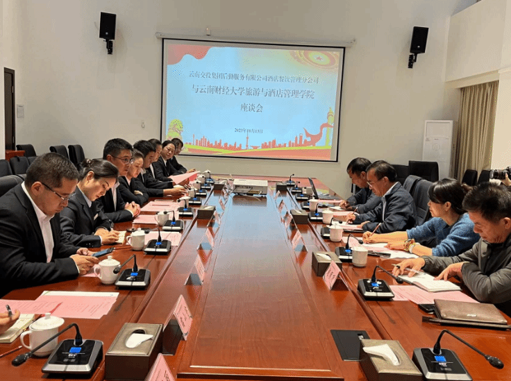 旅游与酒店管理学院实践实训科科长赵顺顶、学术与培训中心主任班先海,云南交投集团后勤服务有限公司酒店餐饮管理分公司各业务板块的负责人参加座谈。
