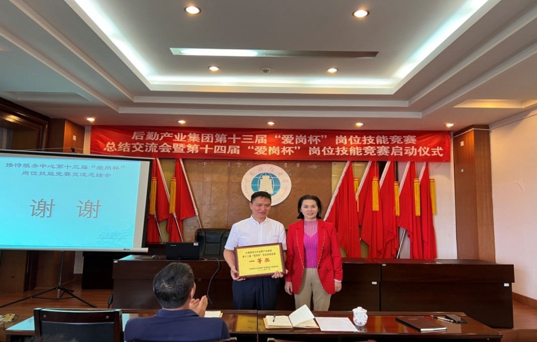 集团总经理李光香宣布后勤产业集团第十四届“爱岗杯”岗位技能竞赛活动正式启动。上一届岗位技能竞赛获组织奖前三名的部门依次上台交流,分享经验、展示成果。与会集团领导为获得一、二、三等奖的部门颁奖。