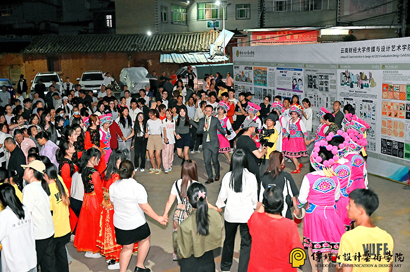 当天晚上,传媒与设计艺术学院2023届毕业设计作品展之“社会融合”主题展暨联欢晚会也在安宁市普河村展区举行,普河村党支部书记肖云凯等村干部及全体村民观看了展览并参加晚会。