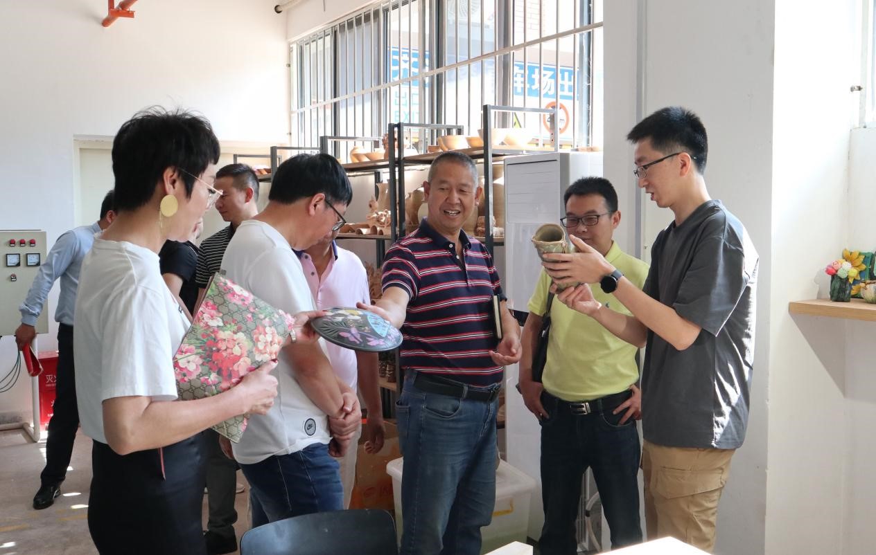 会前,梁卫华一行15人在学院副院长崔木扬带领下,参观了环境设计系“当鲜花遇上旧物”课程设计展,走访了学院“新闻与广告综合实验室”“多功能画室”“布艺工作室”“陶艺工作室”“模型工作室”等专业实训工作室。