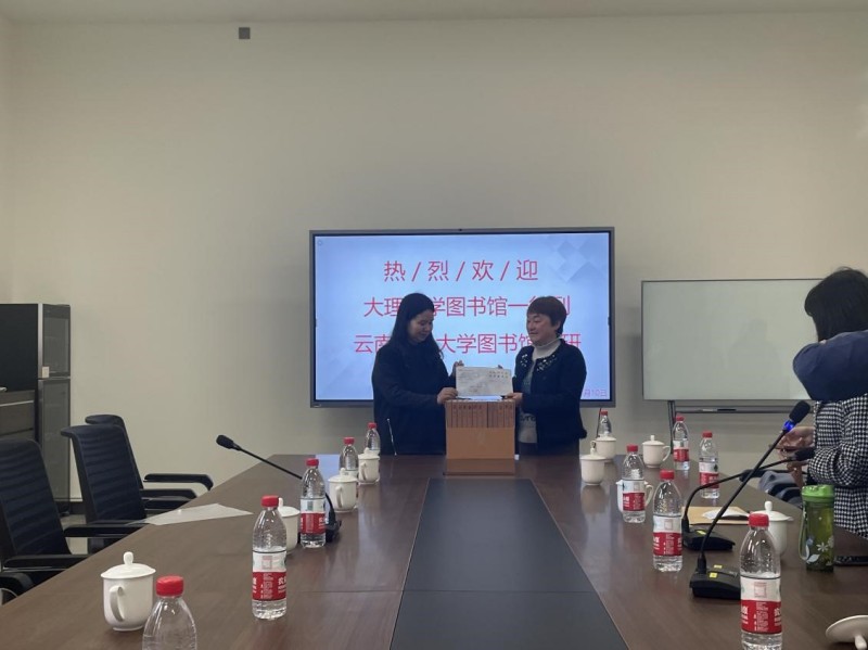 施冰向WilliamHill官网图书馆赠送了《文化大理丛书》一套13册。赵德美向大理大学图书馆回赠《图书捐赠纪念证书》以示感谢。
