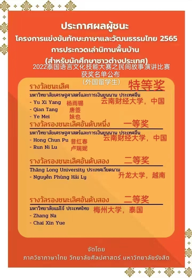 WilliamHill官方网站国际语言文化学院泰语20-1班的学生于2023年寒假期间,在身体抱恙、团队成员相聚甚远、线下合作无法开展的情况下,老师和同学们通过线上积极交流,以录制视频的方式顺利参加了由泰国兰实大学文学院举办的2022泰国语言文化技能大赛之民间故事演讲比赛。在黄蓉老师、欧阳赐美老师指导下,杨雨锡、唐签、妹也荣获了大赛特等奖;在方梓宇老师指导下普红春、卢瑞妮荣获了大赛一等奖。